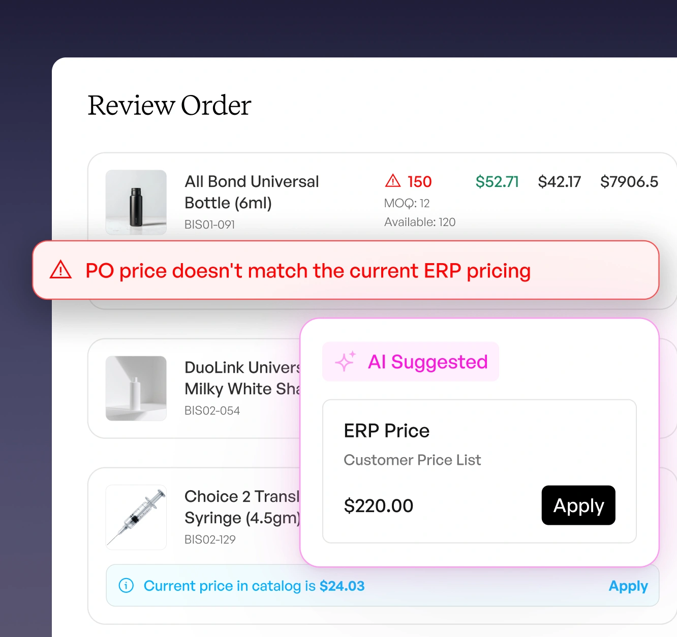 Cross-checks all details against ERP data, price lists, inventory, and past orders.