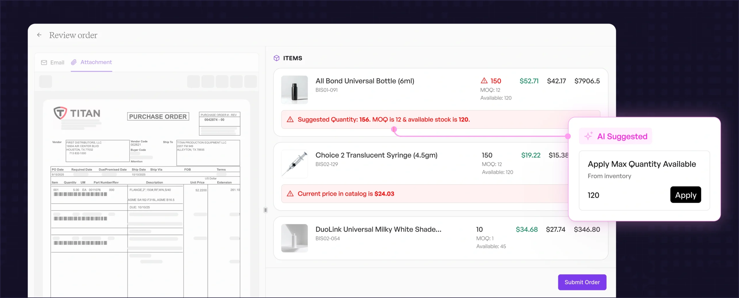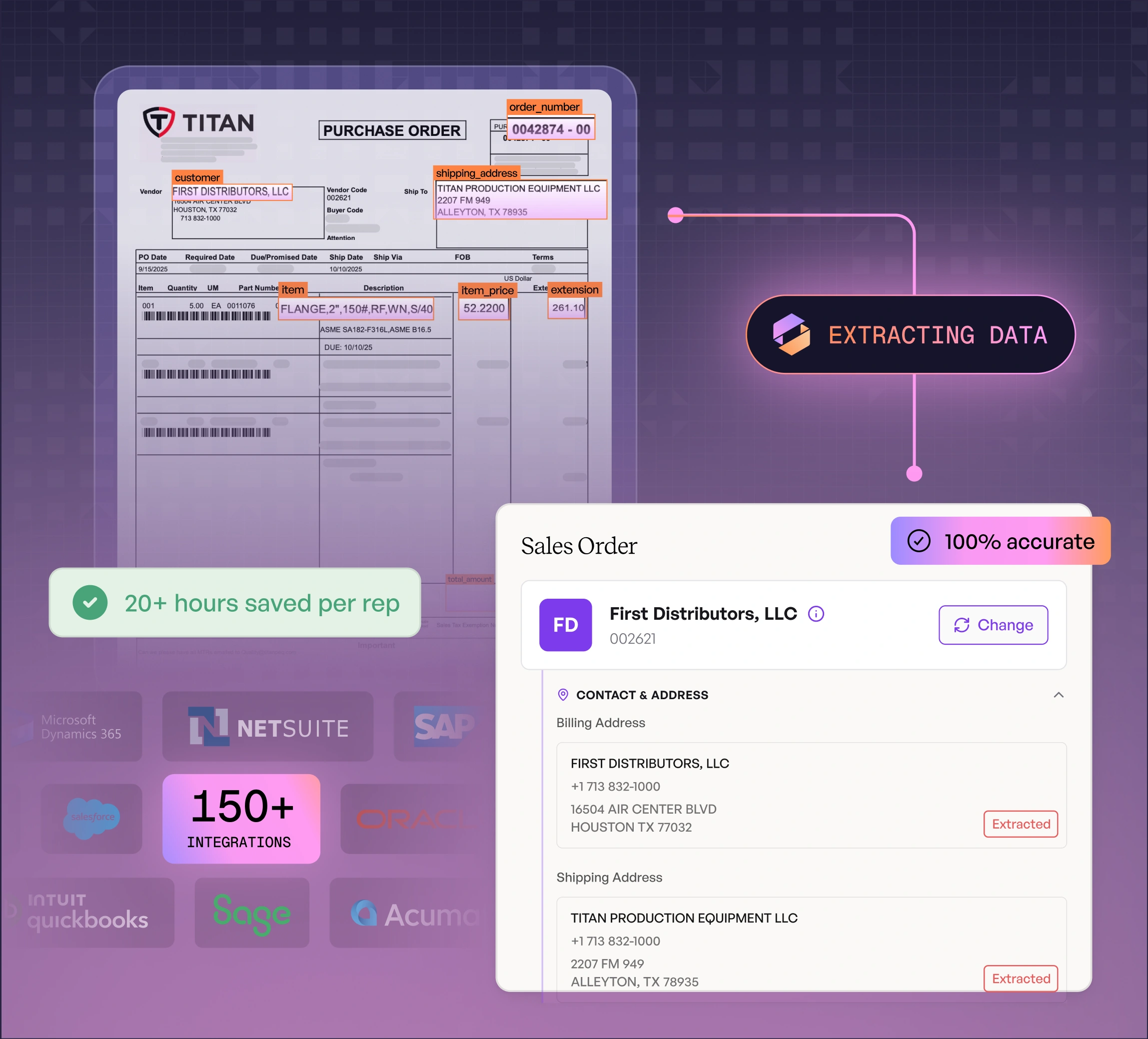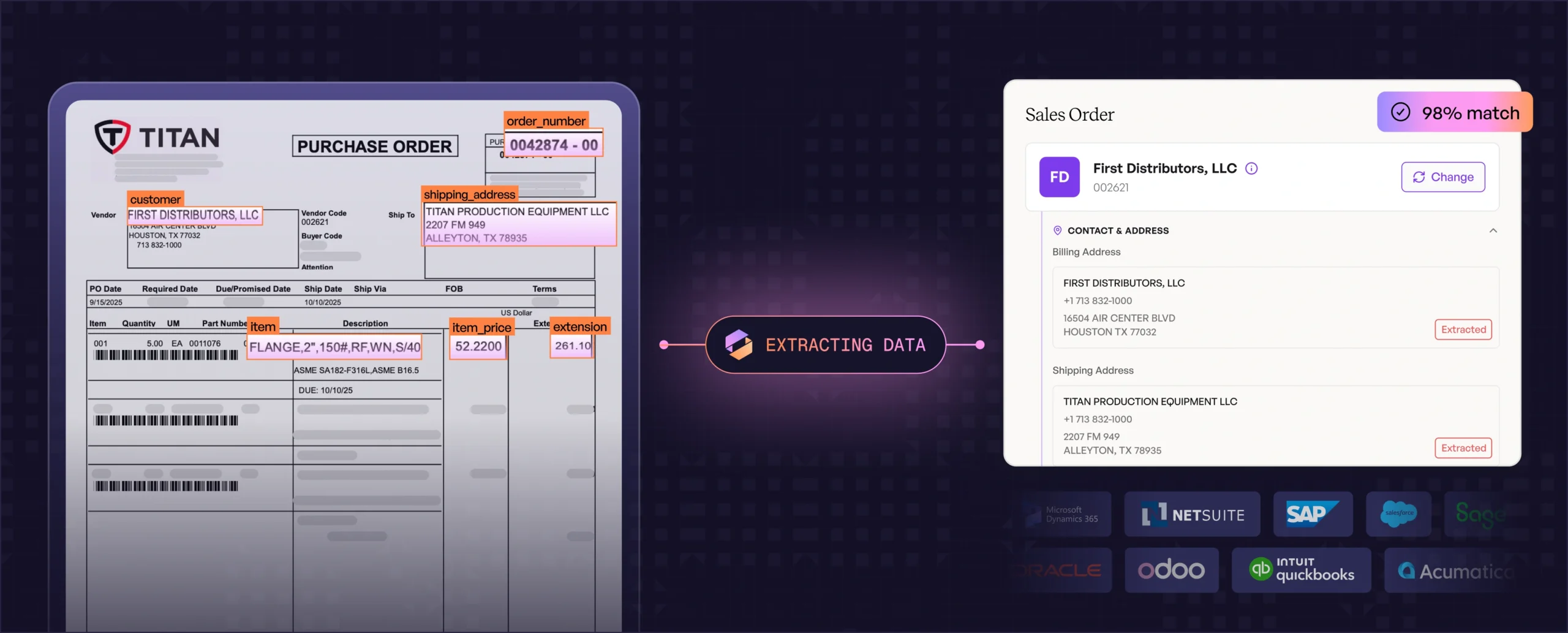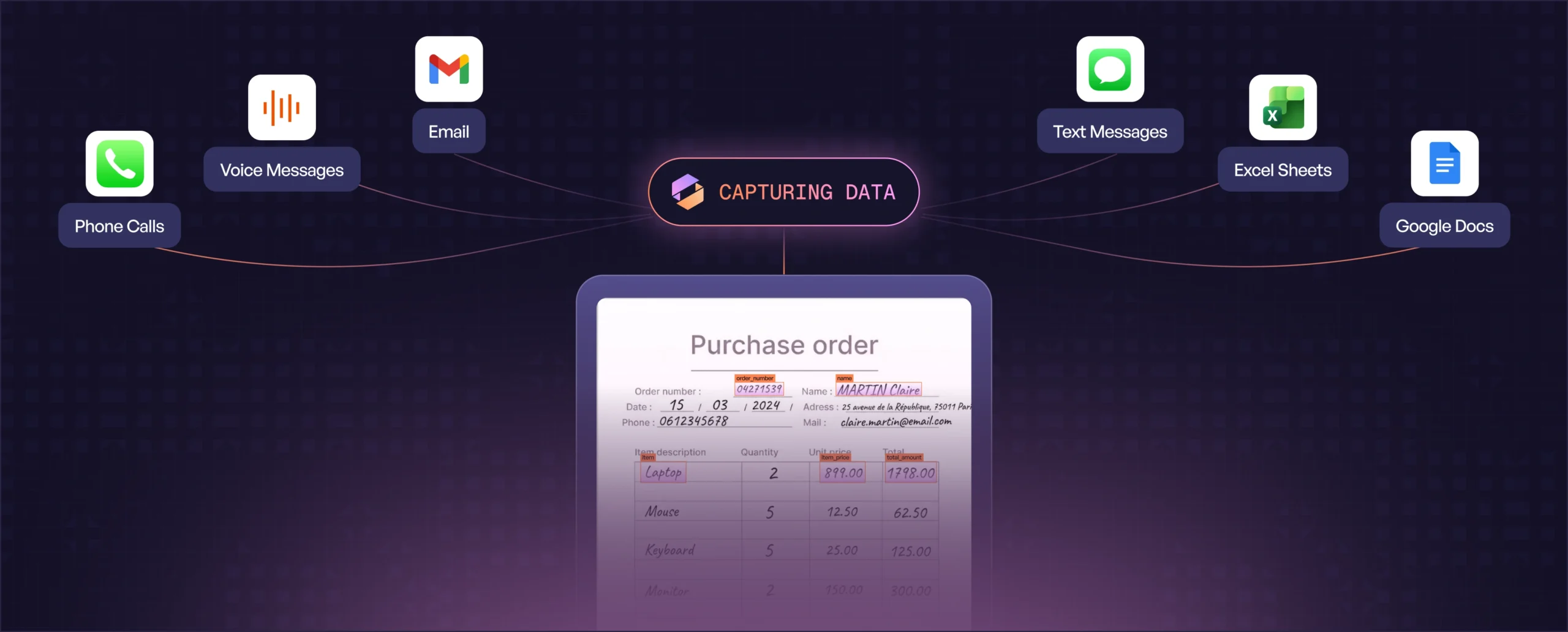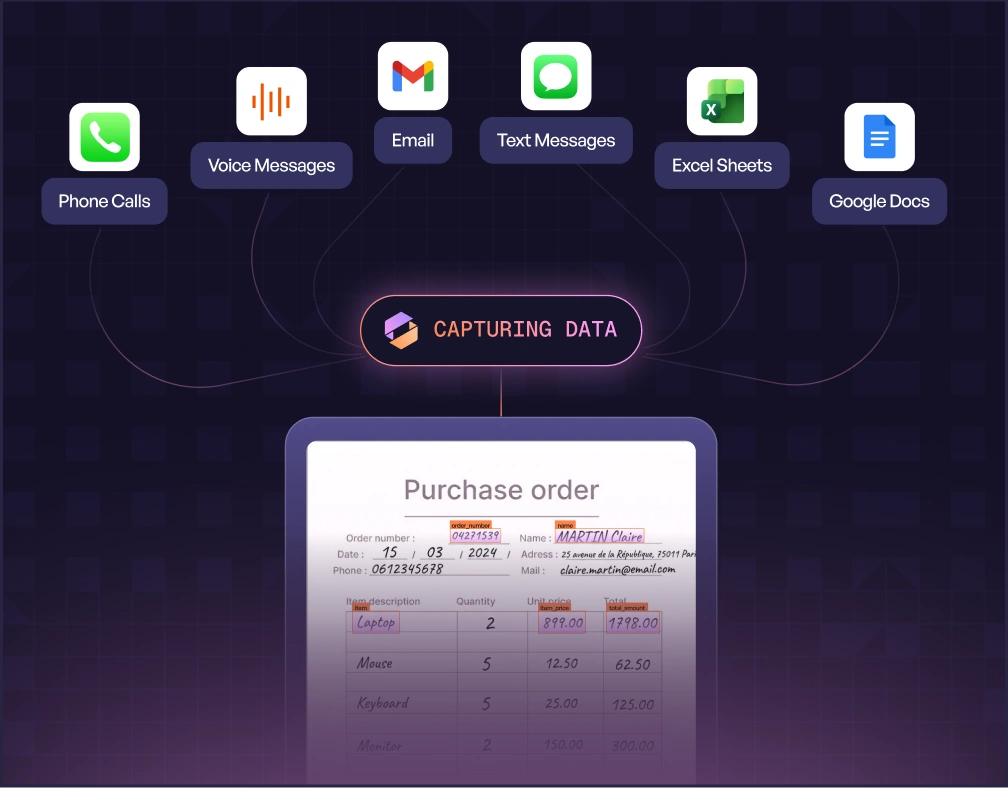 Pulls SKUs, descriptions, quantities, pricing, and customer details from any format.