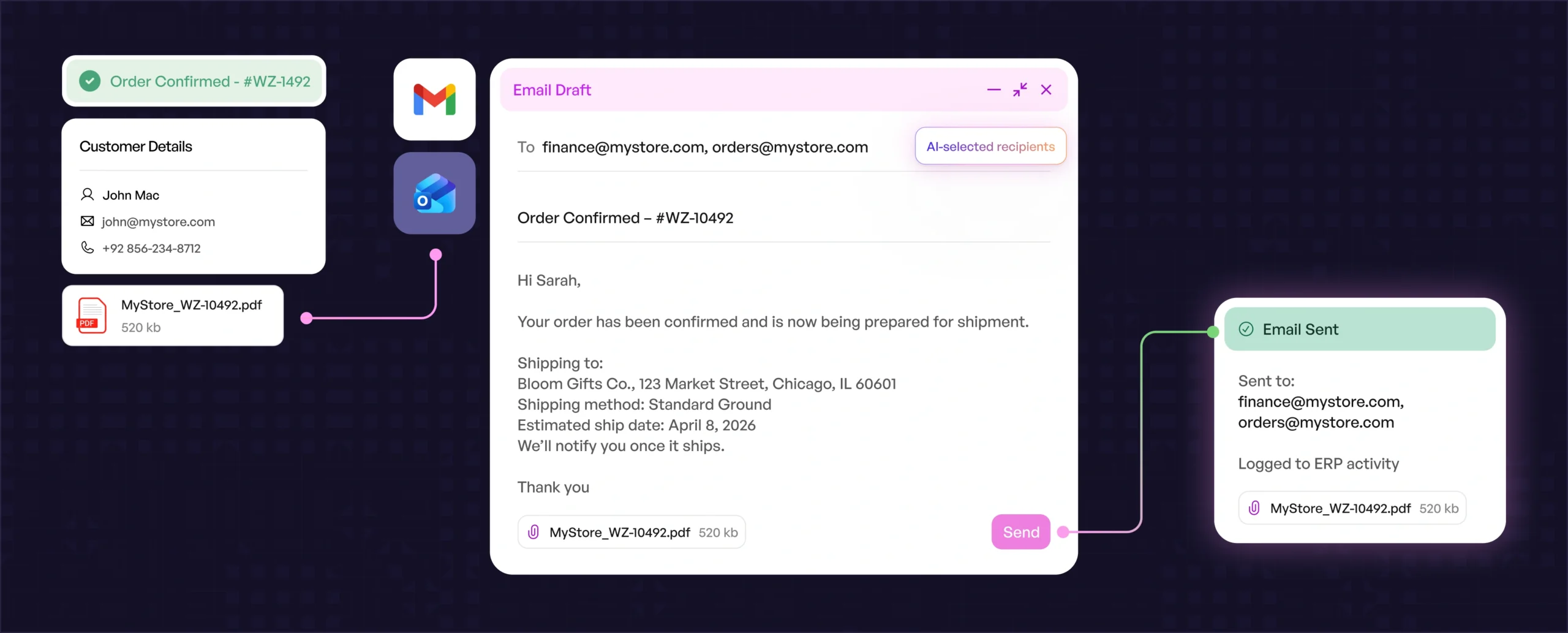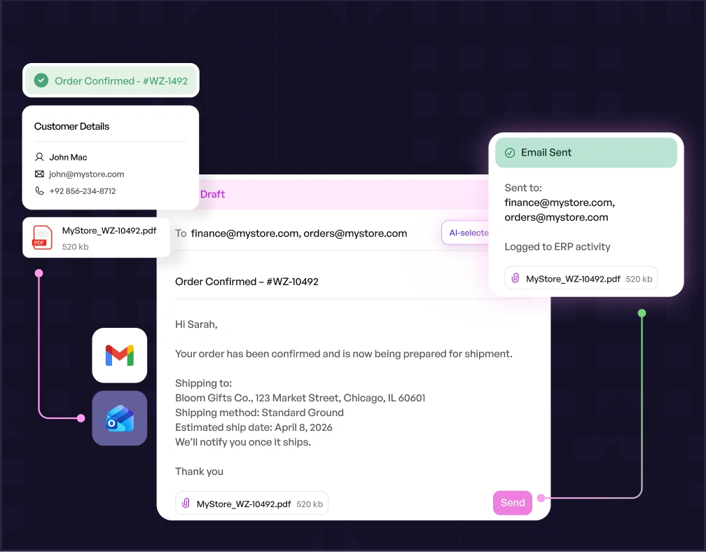 Automatically emails confirmation to customers and sales reps once the order is created.
