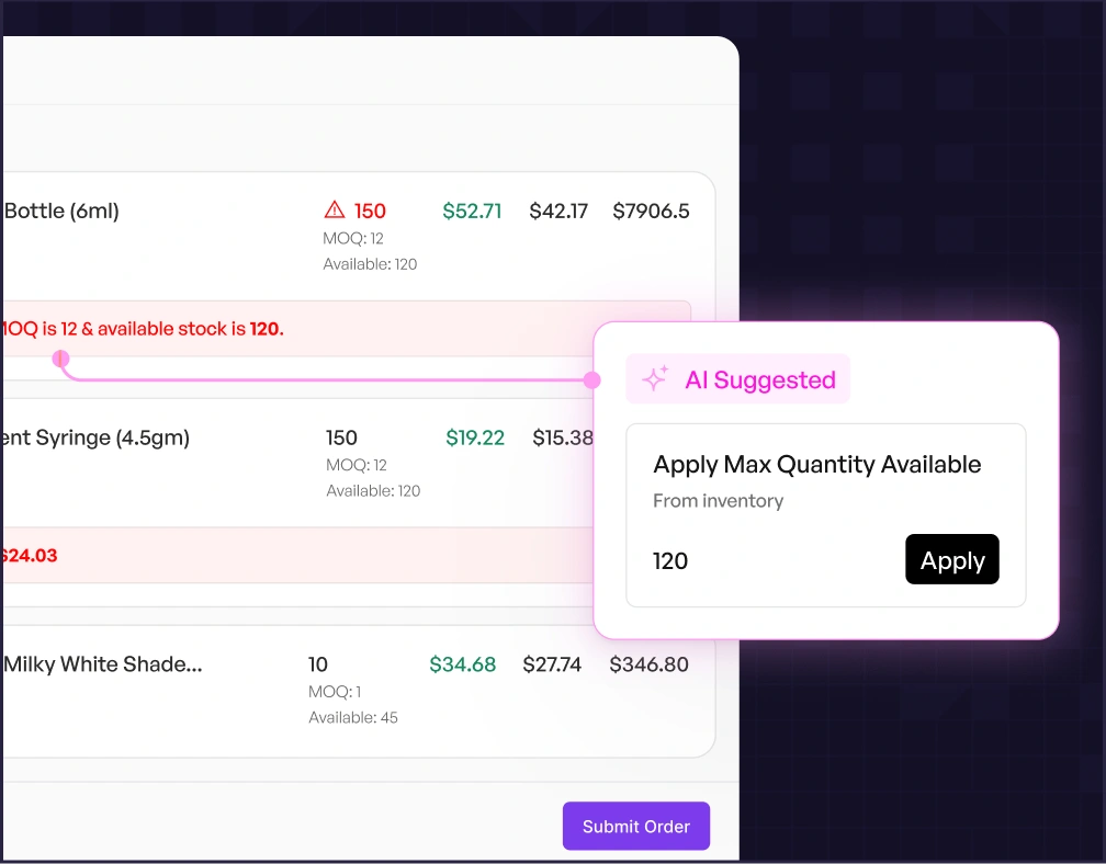 AI improves wholesale order entry by removing repetitive manual work such as reading POs, matching SKUs, validating pricing, and re-entering data into the ERP. Instead of relying on human interpretation and cleanup, AI standardizes incoming orders automatically, reduces errors, and allows teams to process significantly higher order volumes without adding headcount.