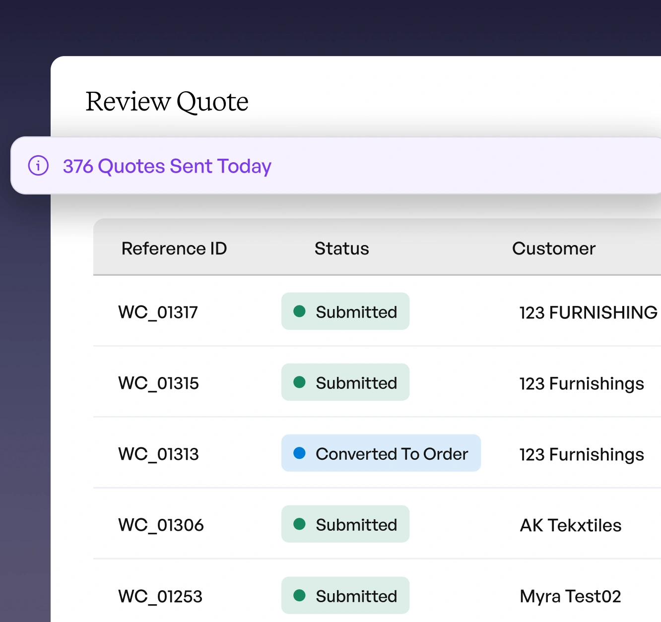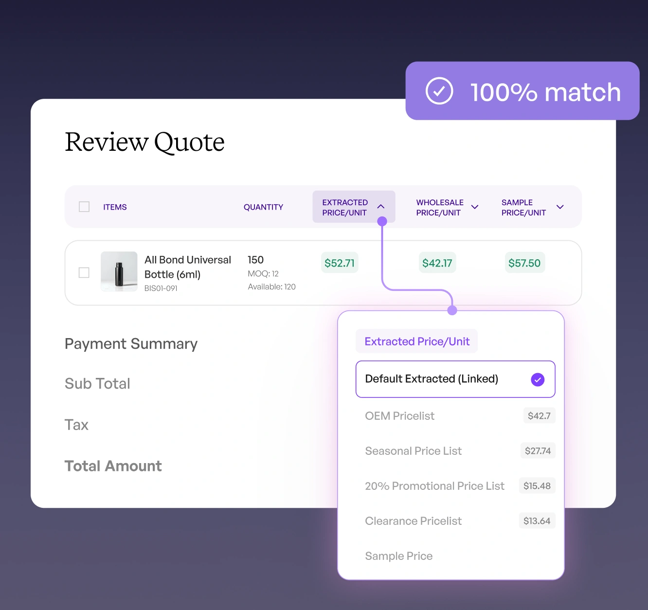 Surfaces all extracted details, pricing logic, and suggestions in one place—so sales teams can review, fine-tune, and send quotes quickly without second-guessing.