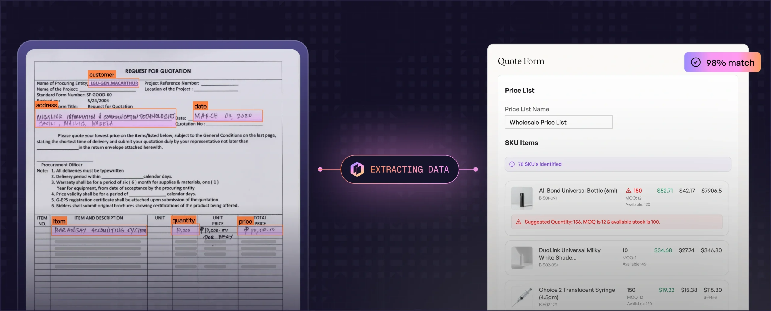 The AI Quoting Assistant matches RFQ line items to your internal SKUs and automatically fills descriptions, pricing, and product details from your ERP.