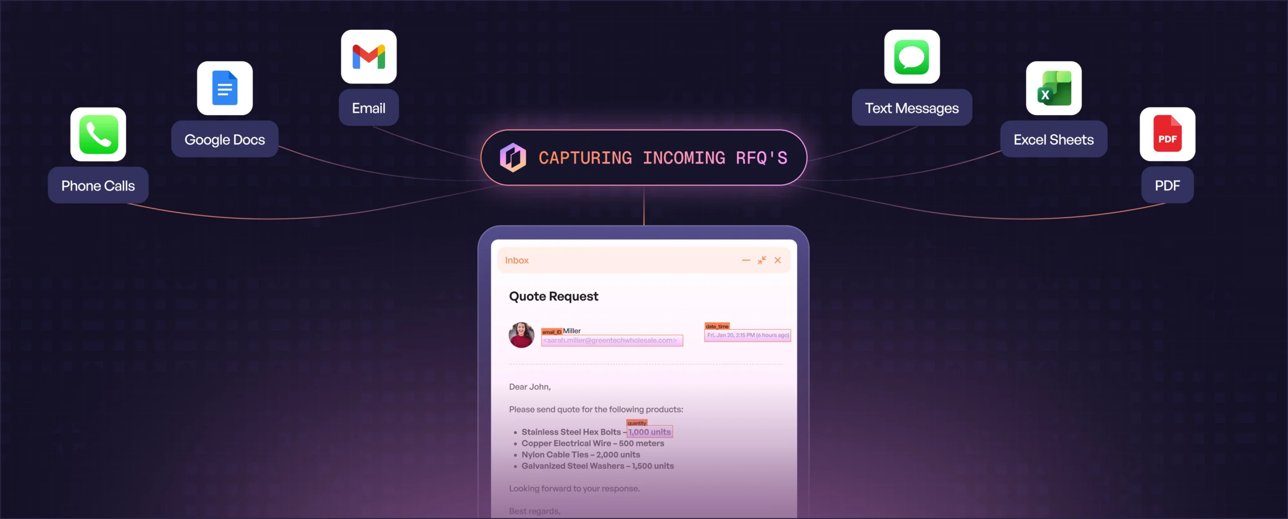 Reads RFQs from emails, PDFs, spreadsheets, and attachments—no matter how customers or prospects send them.