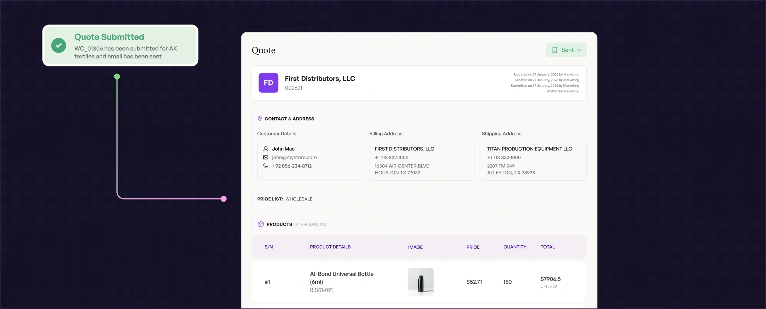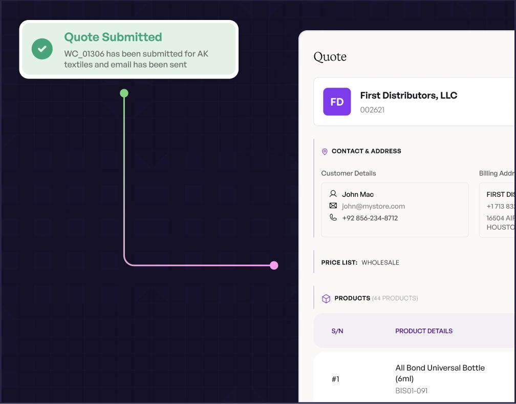 Automated quotation is the process of generating quotes automatically using preset pricing rules, customer-specific terms, and real-time product data, so sales reps don’t have to build quotes from scratch each time. Tools like WizCommerce’s Ella help assemble quote-ready line items, apply the right customer pricing logic, and speed up turnaround while keeping everything consistent and reviewable.