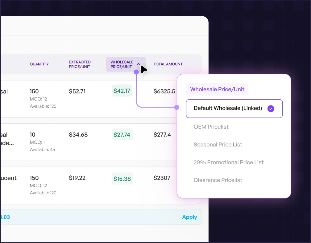 Automatically fills prices using your default price lists, contract pricing, or customer specific rules—while allowing sales to override when needed.