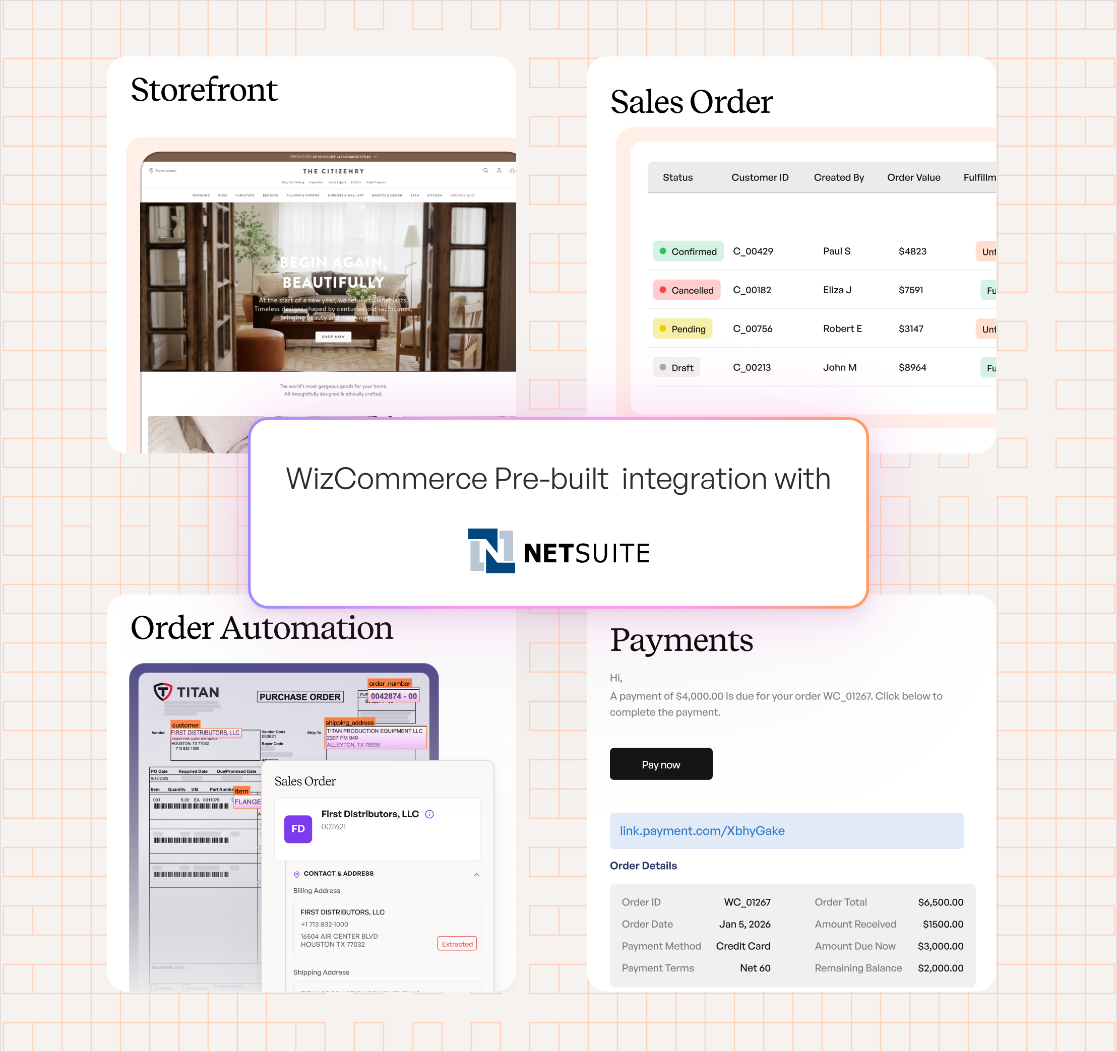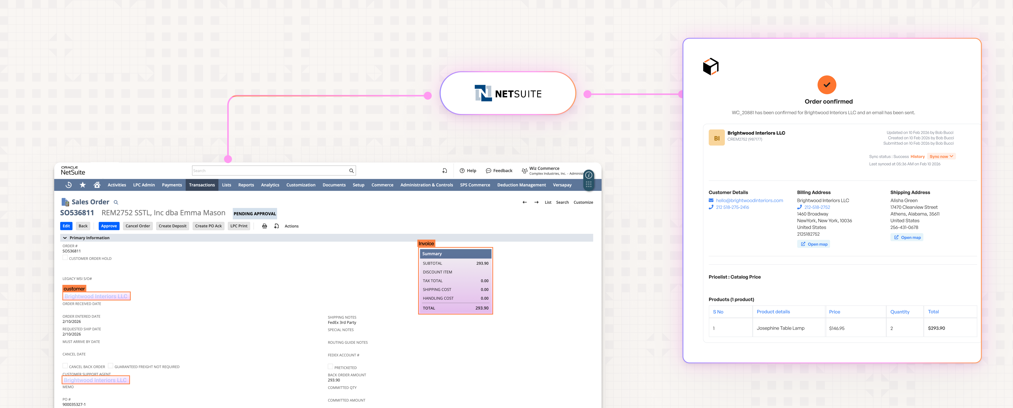 NetSuite remains the system of record. WizCommerce extends it without duplicating logic or data.