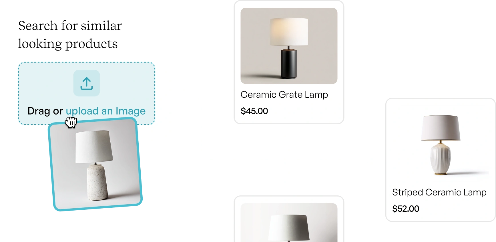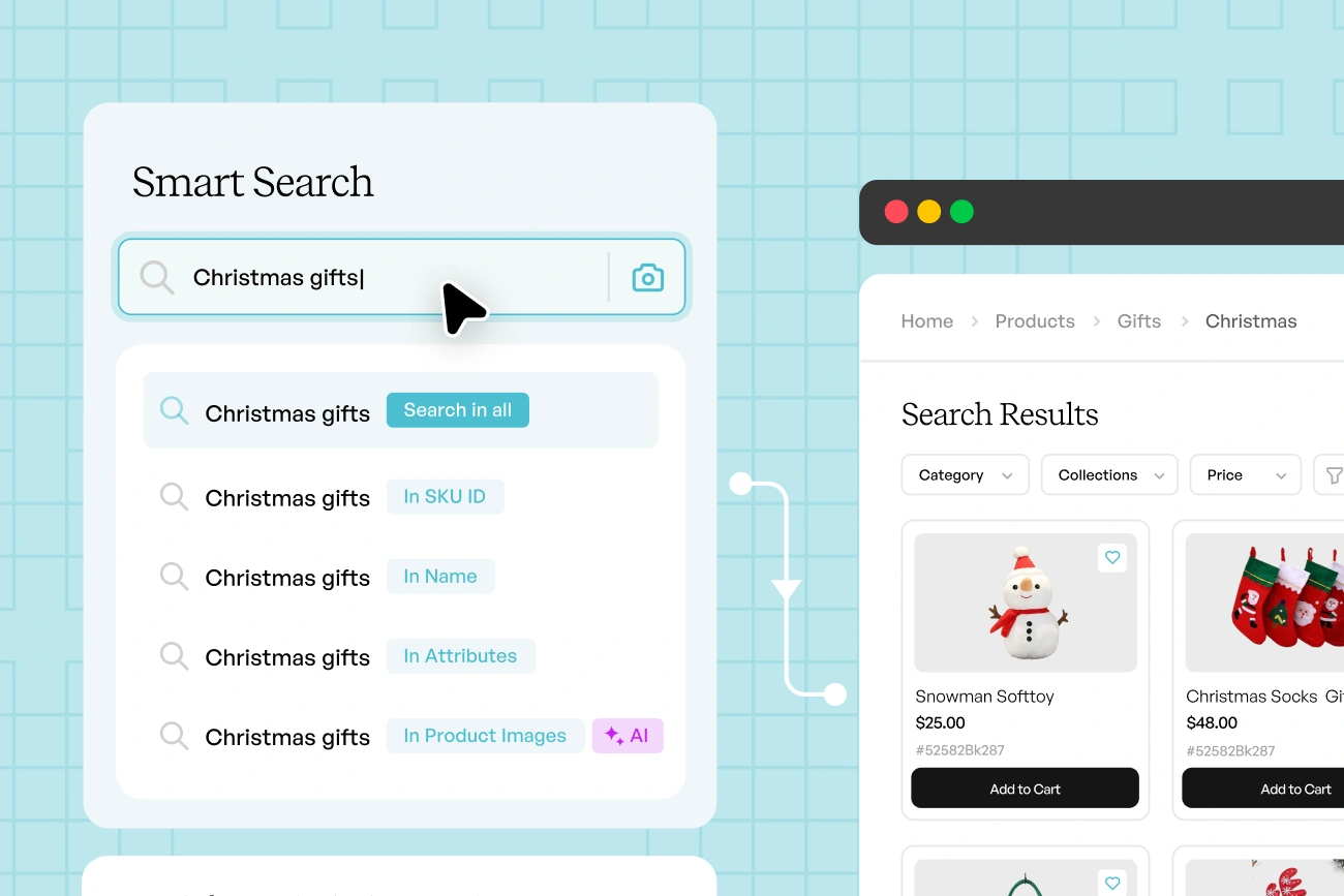 Give buyers universal, fuzzy search, across your entire catalog—by SKU, name, collection, or any attribute—and let them find products instantly with image-based search.