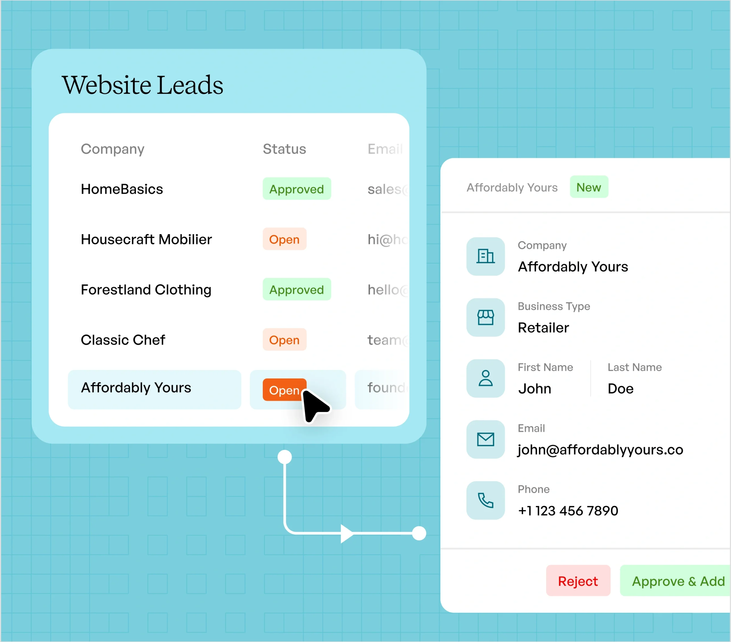 Design lead intake forms that match your requirements, show each lead a tailored storefront and pricing, and approve new buyers with a single click.