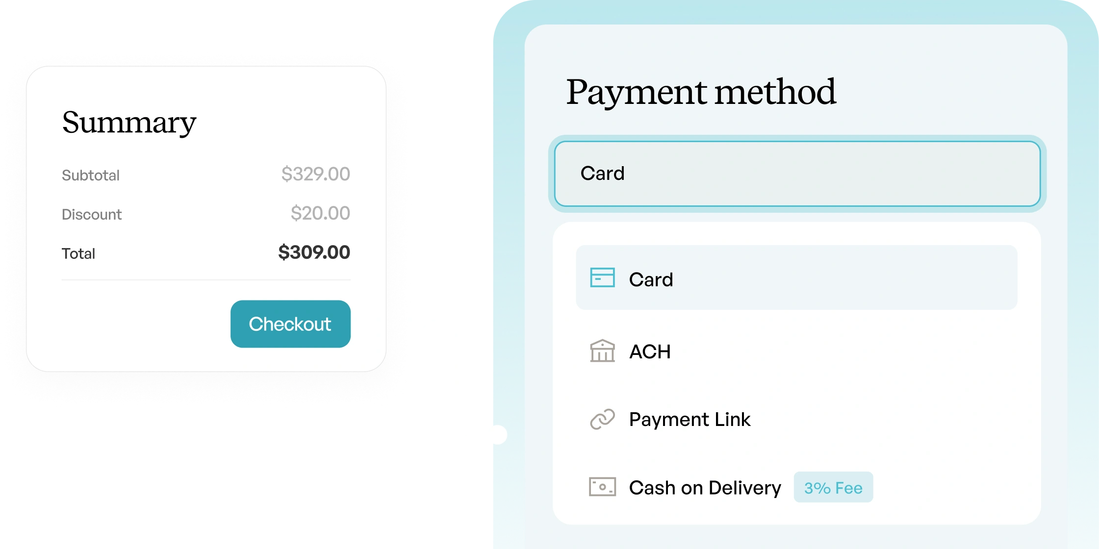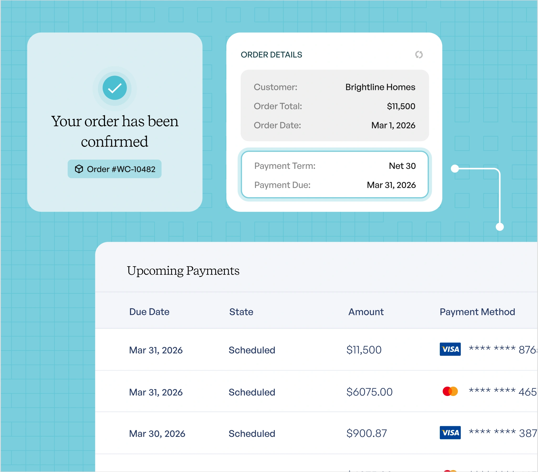 Support cards, ACH, payment terms, deposits, and other methods your business offers—so buyers can always pay the way they prefer at checkout.